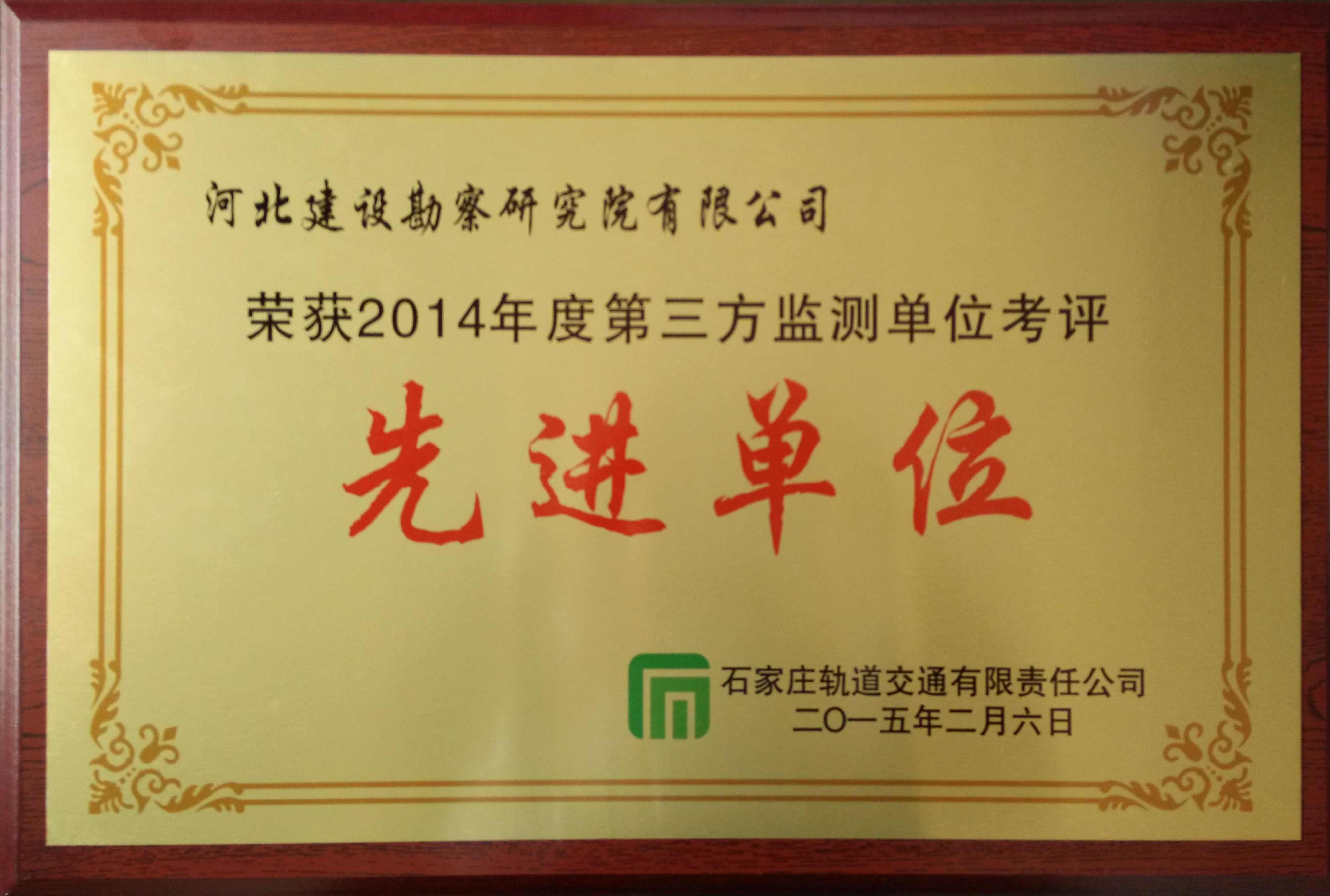 近日,我公司被石家莊軌道交通有限責(zé)任公司評(píng)為2014年度第三方監(jiān)測單位考評(píng)先進(jìn)單位?!?/span>