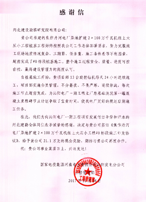 我公司承建的焦作丹河電廠異地擴建2×100萬千瓦機組上大壓小工程樁基工程,始終按照業(yè)主工作總體部署要求,努力克服施工現(xiàn)場地質(zhì)情況復雜、工期緊、任務重、施工條件差等不利因素,超前完成了#0標段樁基施工,整個施工過程安全、質(zhì)量、進度可控在控,贏得了建設管理方的高度認可。11月28日,國家電投集團河南電力有限公司沁陽發(fā)電分公司工程管理部發(fā)來感謝信,對我公司項目部員工表示感謝,并期待與我公司的再度合作。