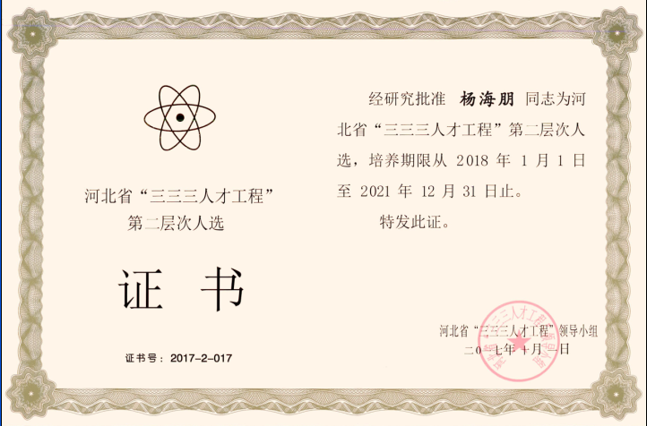 經(jīng)公司推薦,河北省人力資源和社會保障廳組織評審,河北省“三三三人才工程”領導小組批準、公司楊海朋榮獲河北省“三三三人才工程”第二層次人選。