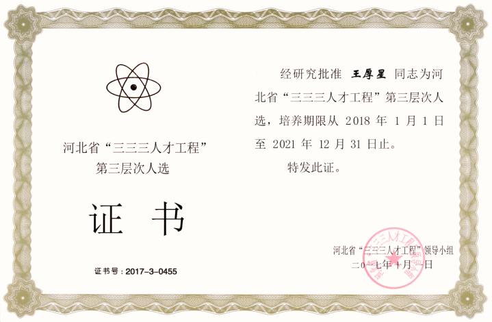 經(jīng)公司推薦,石家莊市人力資源和社會保障局組織評審,報請河北省“三三三人才工程”領導小組備案,公司王厚星榮獲河北省“三三三人才工程”第三層次人選。