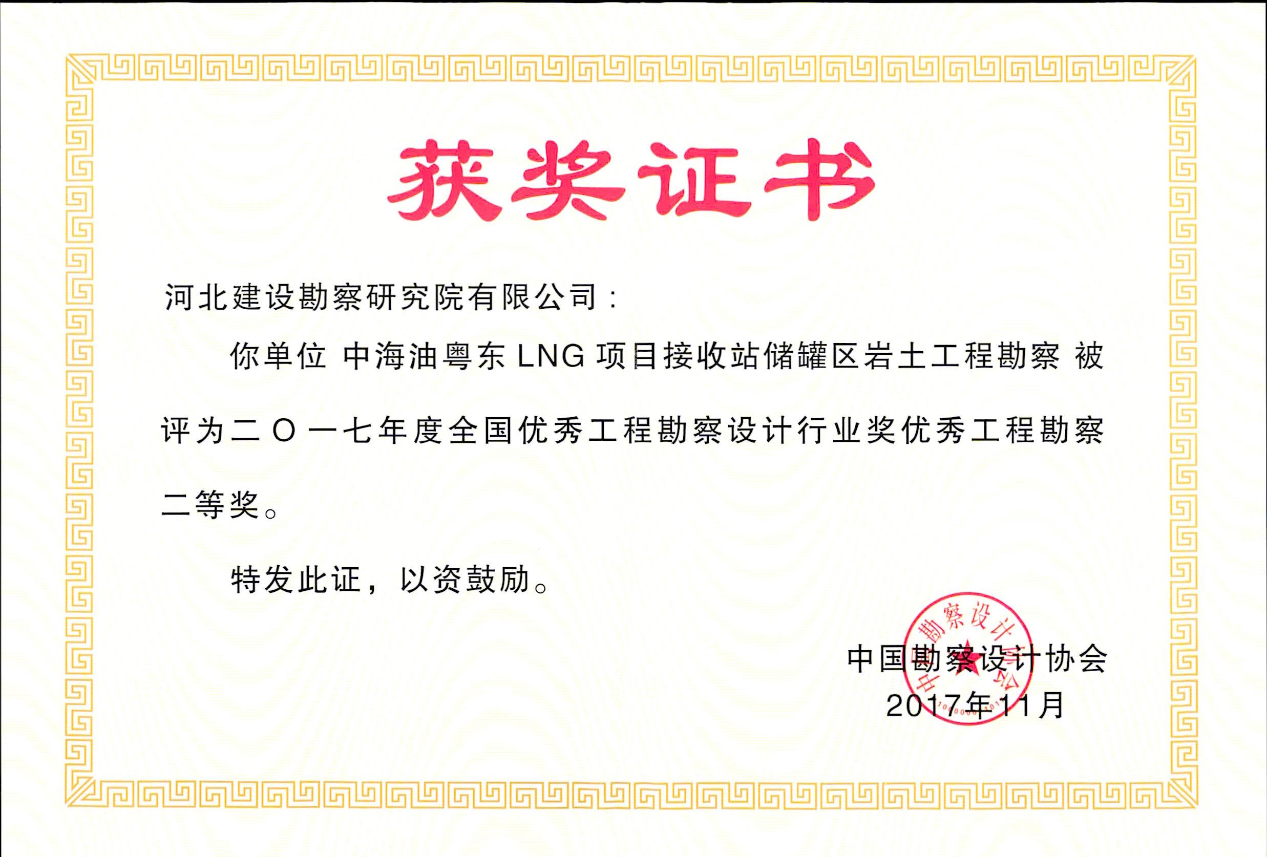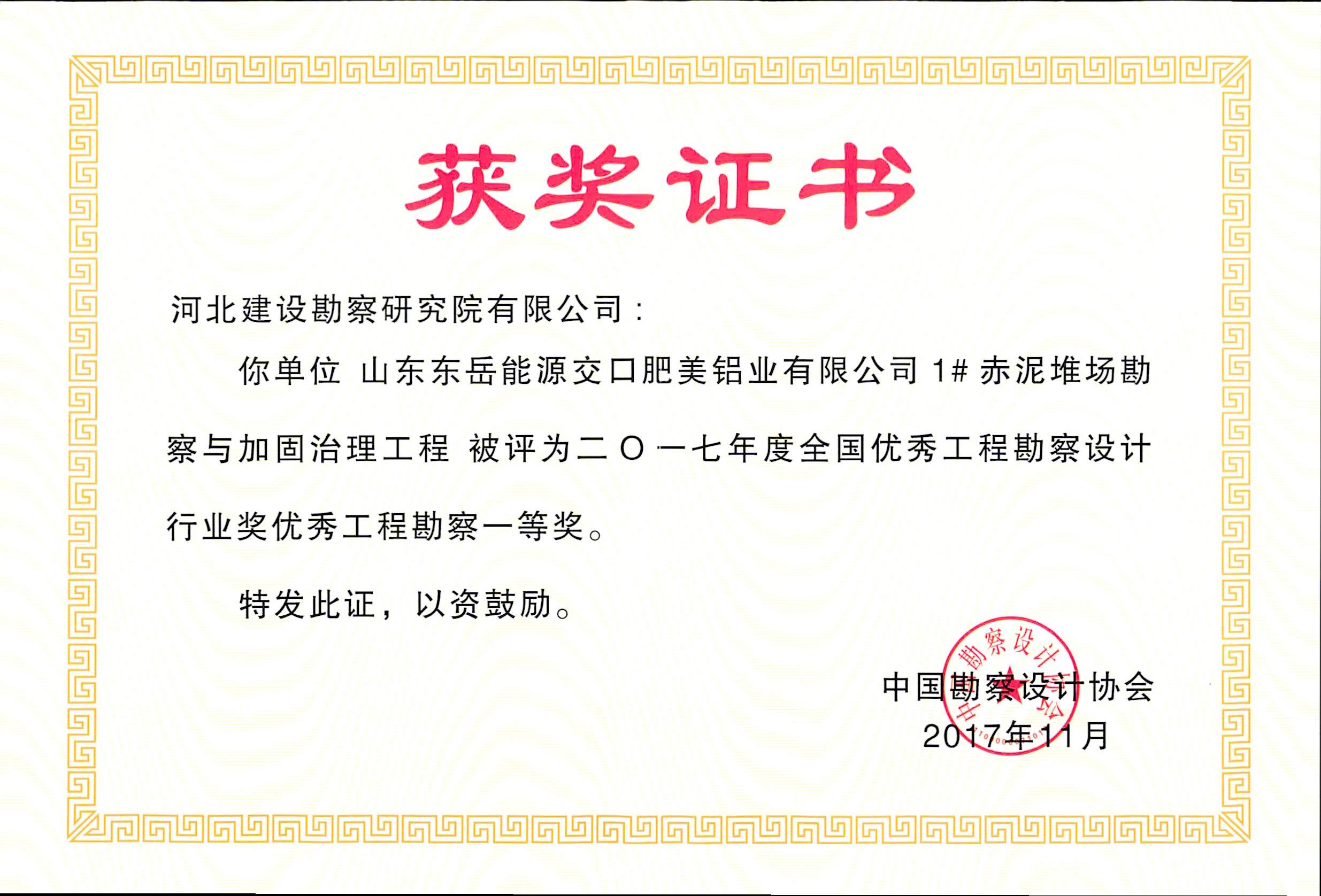 根據(jù)中國勘察設(shè)計(jì)協(xié)會(huì)2017年11月29日發(fā)布的中設(shè)協(xié)字【2017】85號(hào)文件《關(guān)于公布2017年度全國優(yōu)秀工程勘察設(shè)計(jì)行業(yè)獎(jiǎng)評(píng)選結(jié)果的通知》,我公司兩項(xiàng)工程獲優(yōu)秀工程勘察獎(jiǎng)。其中,山東東岳能源交口肥美鋁業(yè)有限公司1#赤泥堆場(chǎng)勘察與加固治理工程榮獲優(yōu)秀工程勘察一等獎(jiǎng),中海油粵東LNG項(xiàng)目接收站儲(chǔ)罐區(qū)巖土工程勘察榮獲優(yōu)秀工程勘察二等獎(jiǎng)。