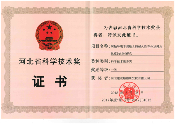 5月30日上午,河北省科學(xué)技術(shù)獎(jiǎng)勵(lì)暨慶祝“全國(guó)科技工作者日”大會(huì)在石家莊舉行。省委書(shū)記王東峰、省長(zhǎng)許勤等省領(lǐng)導(dǎo)出席大會(huì),并為榮獲2017年度河北省科學(xué)技術(shù)獎(jiǎng)勵(lì)代表和第十屆河北省優(yōu)秀科技工作者代表頒發(fā)證書(shū)。我公司《腐蝕環(huán)境下混凝土的耐久性壽命預(yù)測(cè)及抗腐蝕材料研究》獲省科技進(jìn)步一等獎(jiǎng)、《素混凝土剛性樁復(fù)合地基核心技術(shù)研究與工程應(yīng)用》獲三等獎(jiǎng),聶慶科總工程師代表公司參加了大會(huì)并上臺(tái)領(lǐng)獎(jiǎng)。這是我公司繼2014、2015年度后再獲河北省科技進(jìn)步一等獎(jiǎng),對(duì)我們既是極大鼓舞和肯定,也必將激勵(lì)和鞭策廣大專業(yè)技術(shù)人員,以黨的十九大精神和習(xí)總書(shū)記在兩院院士大會(huì)講話精神為指引,積極投身創(chuàng)新實(shí)踐,大力開(kāi)展科研攻關(guān),為不斷推進(jìn)巖土工程技術(shù)發(fā)展、提升企業(yè)創(chuàng)新能力和核心競(jìng)爭(zhēng)力而繼續(xù)努力奮斗。