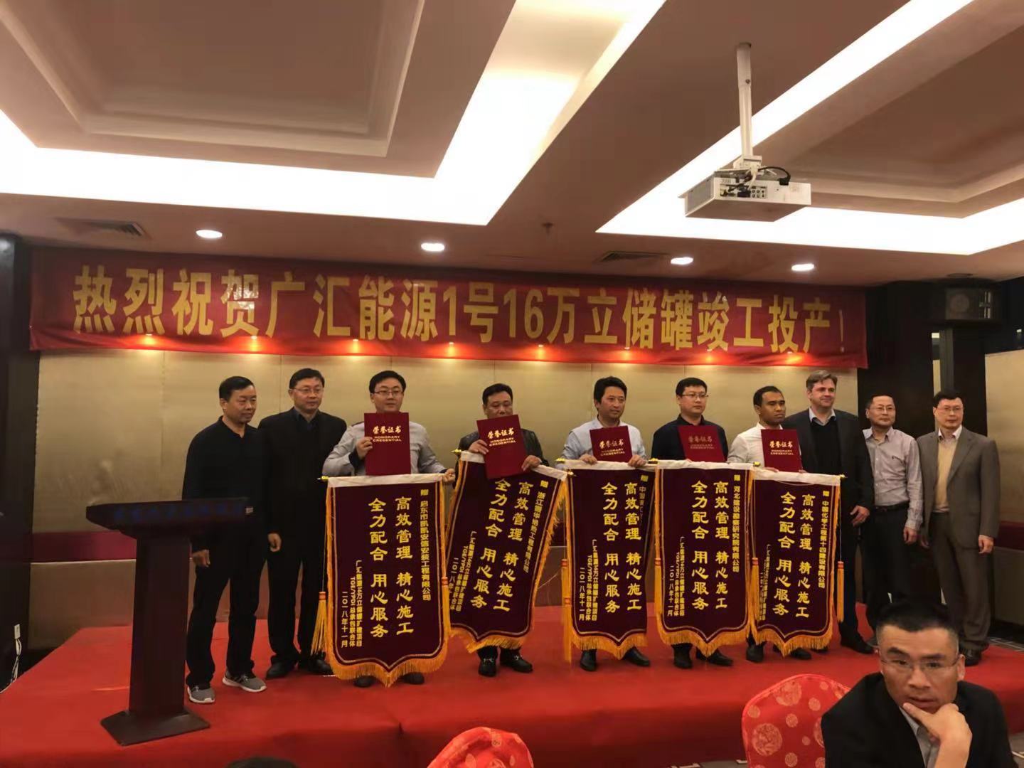 2018年11月21日,廣匯能源1號(hào)16萬(wàn)m³儲(chǔ)罐項(xiàng)目順利投產(chǎn),并創(chuàng)造了LNG行業(yè)新的記錄。在竣工投產(chǎn)慶功會(huì)上,廣匯能源總經(jīng)理和TGE總經(jīng)理對(duì)我公司在項(xiàng)目中的突出貢獻(xiàn)給予了高度贊揚(yáng),并授予錦旗和“優(yōu)秀分包商”證書(shū),同時(shí)也對(duì)我公司在2號(hào)16萬(wàn)立方儲(chǔ)罐施工過(guò)程中的優(yōu)秀表現(xiàn)提出了表?yè)P(yáng),并期望我公司更多的參與廣匯能源的項(xiàng)目建設(shè)。