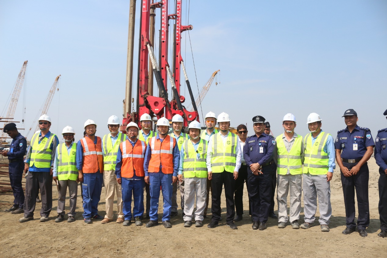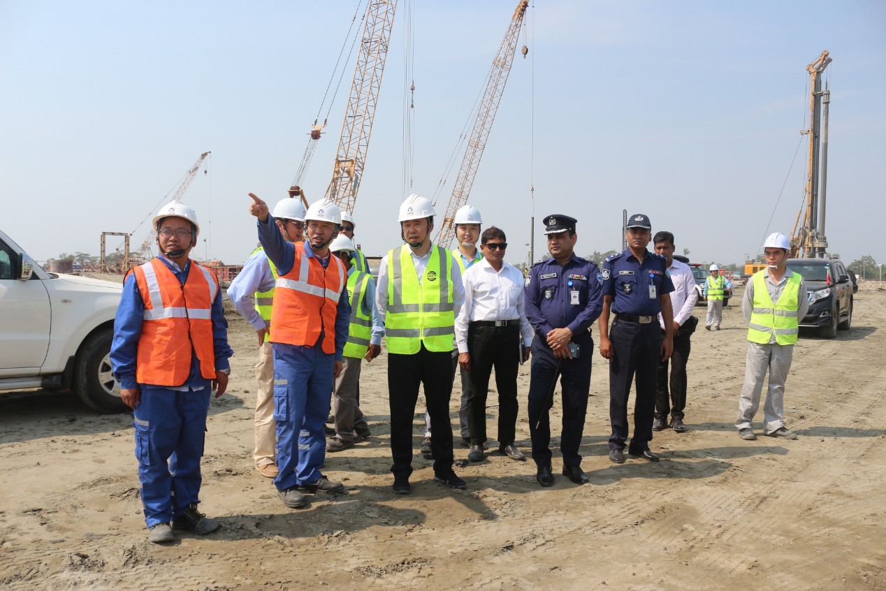 2019年2月23日,駐孟加拉國(guó)特命全權(quán)大使張佐蒞臨我公司孟加拉吉大港艾薩拉姆超超臨界燃煤機(jī)組樁基工程施工現(xiàn)場(chǎng)進(jìn)行視察。公司駐孟加拉辦事處主任李福來(lái)、項(xiàng)目經(jīng)理丁偉和EPC總包單位山東電建三公司部分員工以及吉大港市警察局最高警司全程陪同。