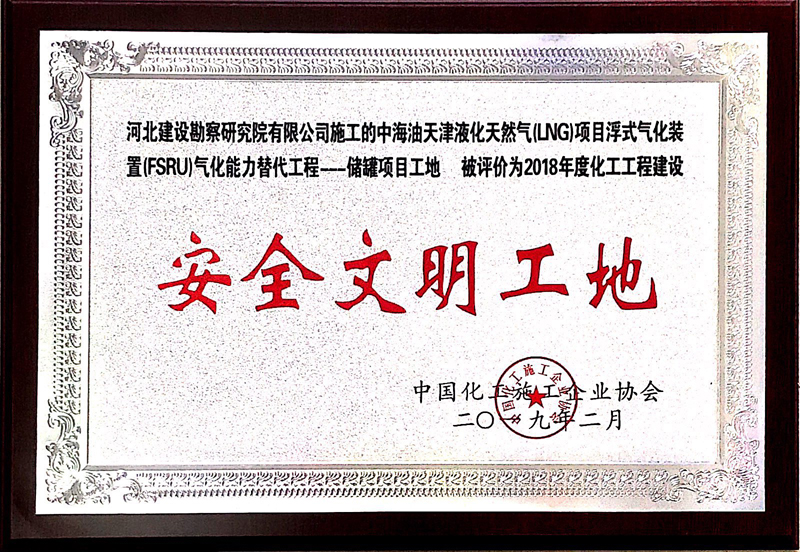 近日傳來喜訊,我公司承接施工的中海油天津液化天然氣(LNG)項(xiàng)目浮式氣化裝置(FSRU)氣化能力替代工程-儲罐項(xiàng)目樁基工程工地被評為2018年度中國化工工程建設(shè)安全文明工地,紅彤彤的證書不僅是榮譽(yù)和驕傲,也是對我們中海油天津LNG替代工程項(xiàng)目部全體員工付出汗水的最好回報(bào)和肯定。