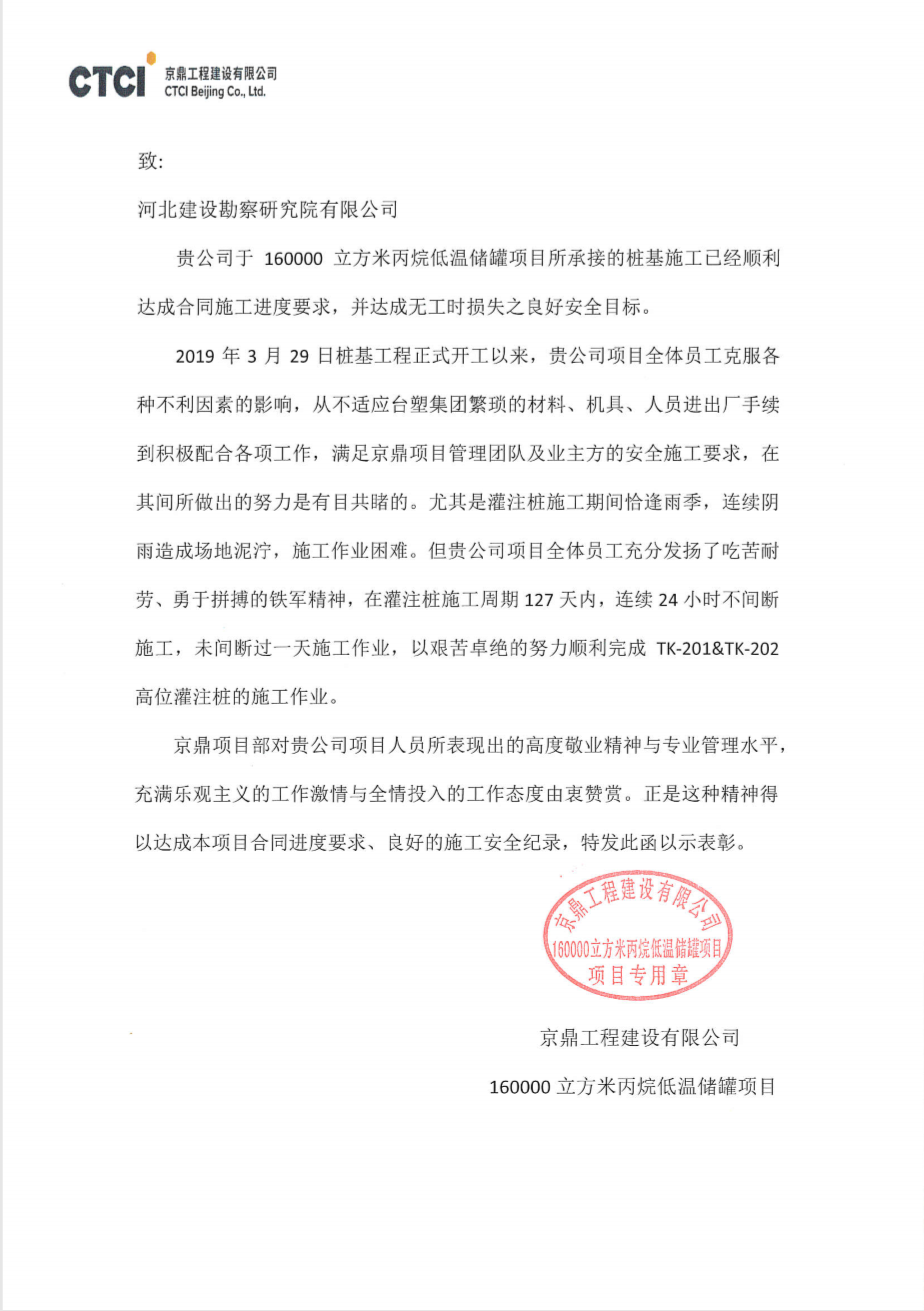 我公司承接的160000立方米丙烷低溫儲(chǔ)罐樁基施工工程,自開(kāi)工以來(lái),項(xiàng)目部全體員工克服各種不利因素的影響,經(jīng)過(guò)艱苦卓絕的不懈努力,已順利達(dá)成合同施工進(jìn)度要求,并達(dá)成無(wú)工時(shí)損失之良好安全目標(biāo),滿足京鼎項(xiàng)目團(tuán)隊(duì)及業(yè)主方的安全施工要求,已圓滿完成各項(xiàng)施工任務(wù),順利完工。期間所表現(xiàn)出的高度敬業(yè)精神和專業(yè)管理水平,得到了業(yè)主和監(jiān)理的一致好評(píng),近期特向我公司發(fā)函予以表?yè)P(yáng)。