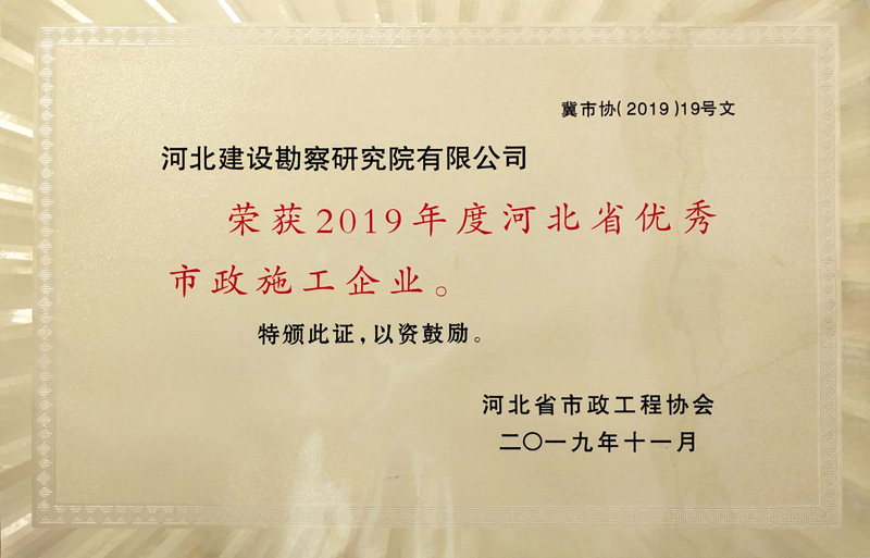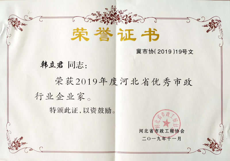 近日公司被河北省市政工程協(xié)會(huì)評(píng)為“2019年度河北省優(yōu)秀市政施工企業(yè)”;公司董事長韓立君同志獲評(píng)“2019年度河北省優(yōu)秀市政行業(yè)企業(yè)家”。