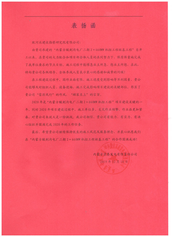 近日,由我公司承建的內(nèi)蒙古酸刺溝二期2×660WM機組工程樁基工程收到甲方內(nèi)蒙古京泰發(fā)電有限公司的表揚信,對項目部全體員工的辛勤付出,給予了高度認可和評價,并為后續(xù)雙方的合作奠定了良好基礎(chǔ)。這充分彰顯了河北建勘人“雷厲風行”的作風,“顧客至上”的宗旨。我們將繼續(xù)保持我們的施工風范和服務(wù)理念,再接再厲,圓滿完成后續(xù)施工任務(wù)!