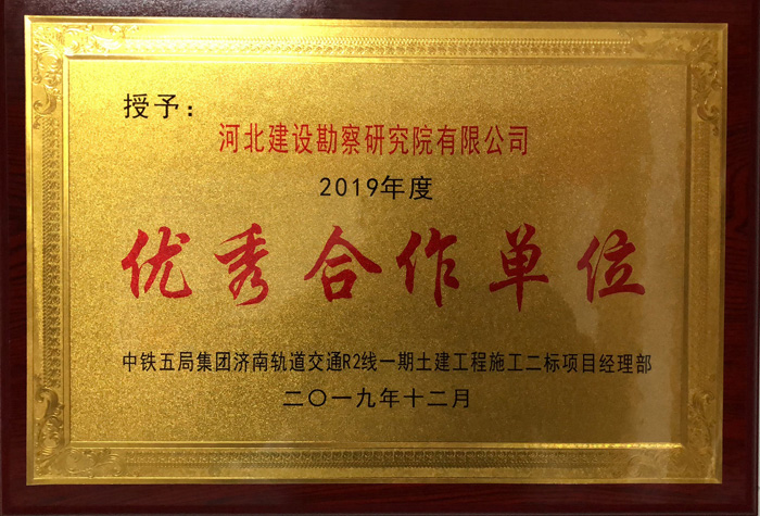 由我公司承接的濟(jì)南市軌道交通R2線施工監(jiān)測項(xiàng)目,近日收到中鐵五局集團(tuán)濟(jì)南地鐵項(xiàng)目部的表揚(yáng)信,并授予我公司“2019年度優(yōu)秀合作單位”、郝迪培班組“2019年度優(yōu)秀班組”兩項(xiàng)榮譽(yù)獎牌。