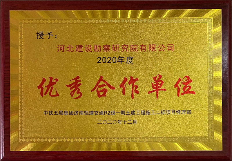 近日,由我公司承接的濟(jì)南軌道交通R2線施工監(jiān)測項目,榮獲中鐵五局集團(tuán)濟(jì)南軌道交通R2線一期工程項目土建二標(biāo)經(jīng)理部 “2020年度優(yōu)秀合作單位”和“郝迪培2020年度優(yōu)秀班組長”兩項榮譽(yù)獎牌。