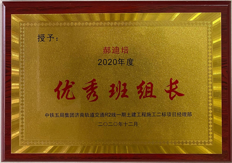 為此中鐵五局集團(tuán)濟(jì)南軌道交通R2線一期工程項目土建二標(biāo)經(jīng)理部特授予我公司“2020年度優(yōu)秀合作單位”和“郝迪培2020年度優(yōu)秀班組長” 兩項榮譽(yù)獎牌,希望我公司一如既往、繼續(xù)發(fā)揚(yáng)優(yōu)良工作作風(fēng),并希望在今后的工作中,雙方精誠合作,共謀發(fā)展新篇章!
