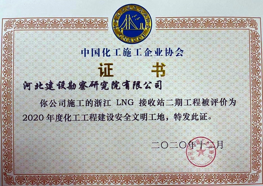 近日,由我公司施工的浙江LNG接收站二期工程被中國(guó)化工施工企業(yè)協(xié)會(huì)評(píng)為“2020年度化工工程建設(shè)安全文明工地”,并獲獎(jiǎng)牌和榮譽(yù)證書(shū)。