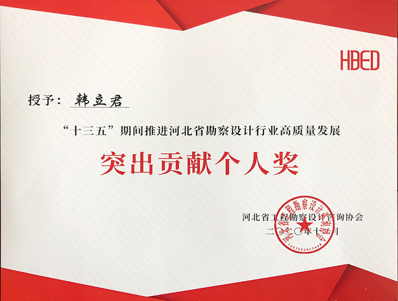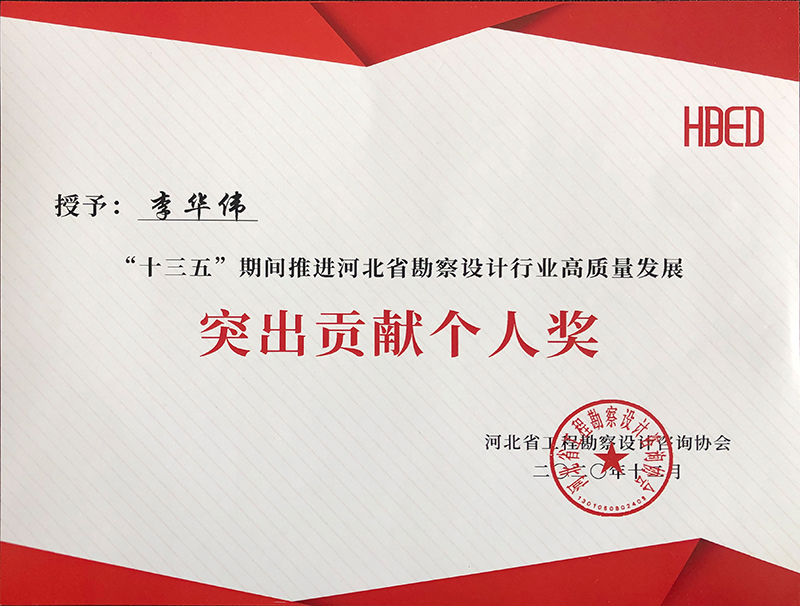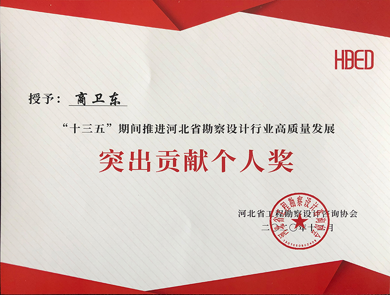 由河北省工程勘察設(shè)計(jì)咨詢協(xié)會(huì)評(píng)選,公司榮獲“十三五”期間推進(jìn)河北省勘察設(shè)計(jì)行業(yè)高質(zhì)量發(fā)展突出貢獻(xiàn)單位,韓立君董事長(zhǎng)、李華偉總經(jīng)理、商衛(wèi)東主任榮獲“十三五”期間“推進(jìn)河北省勘察設(shè)計(jì)行業(yè)高質(zhì)量發(fā)展突出貢獻(xiàn)個(gè)人”。