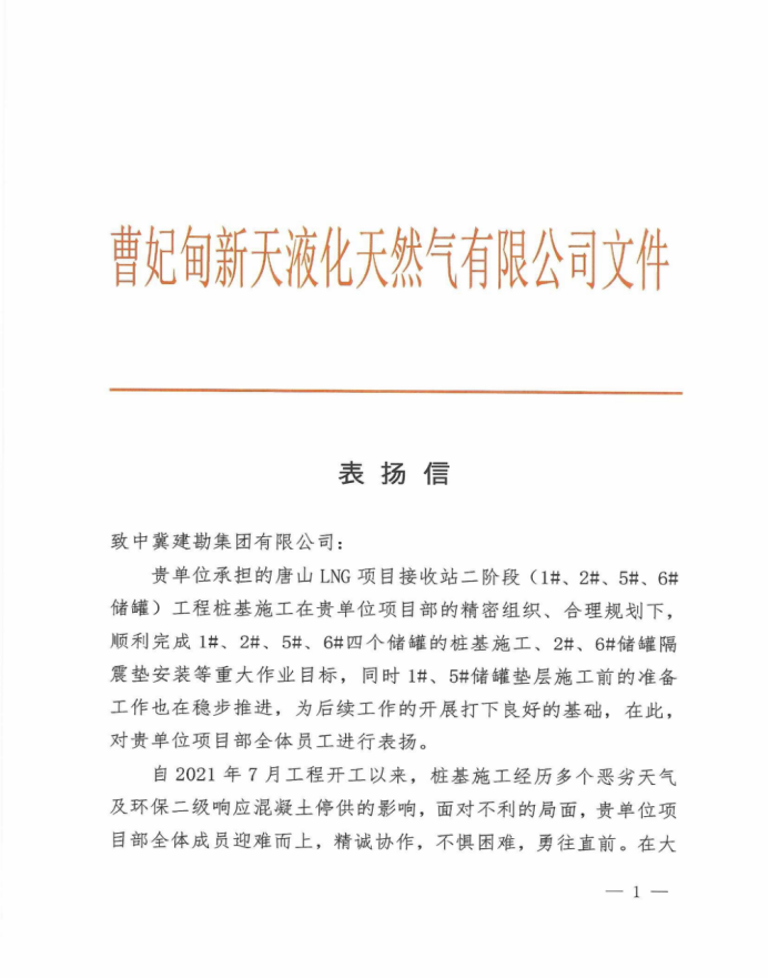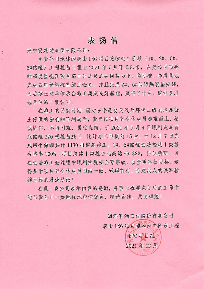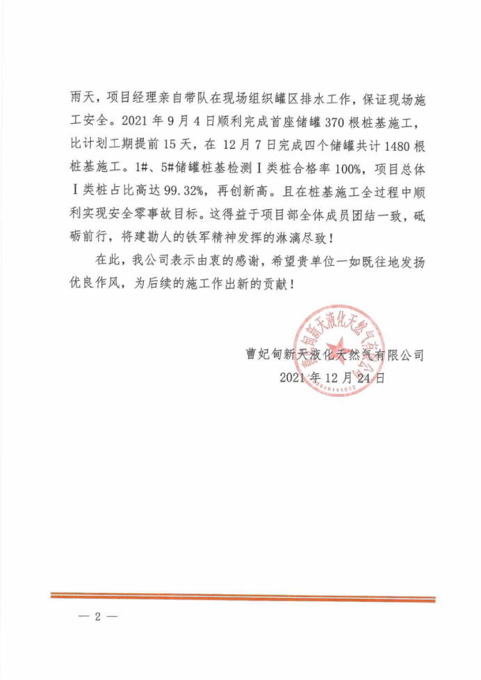 唐山LNG項目接收站二階段工程樁基工程項目部建設(shè)規(guī)模為4座20萬m³LNG儲罐,項目順利實現(xiàn)質(zhì)量零事故、安全零事故目標,贏得總包、監(jiān)理及業(yè)主的一致認可與高度肯定。