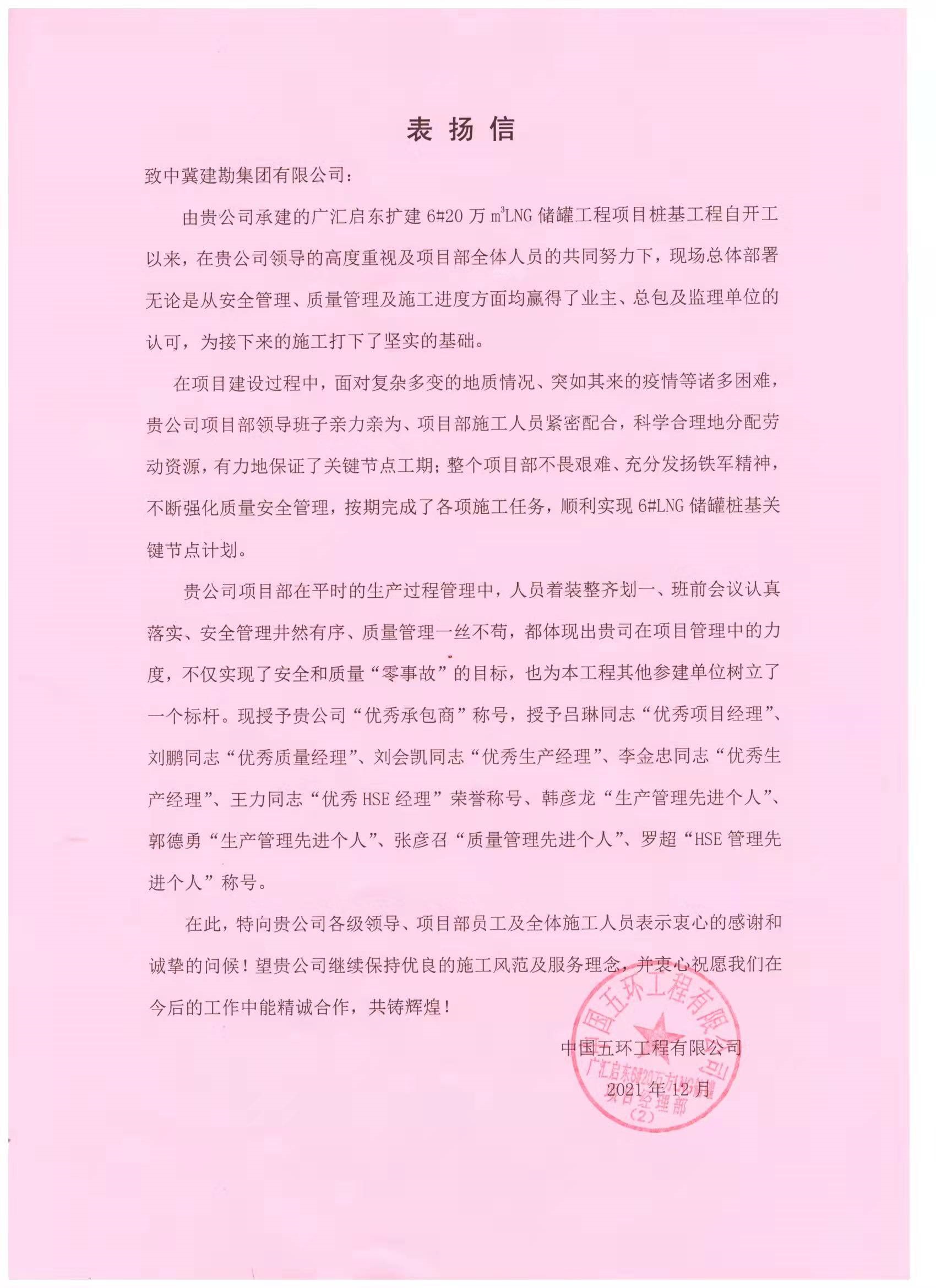 近期公司連續(xù)收到業(yè)主及總包發(fā)來的表揚信,對我公司項目的質(zhì)量及安全管控等方面的工作表示了一致認可。
