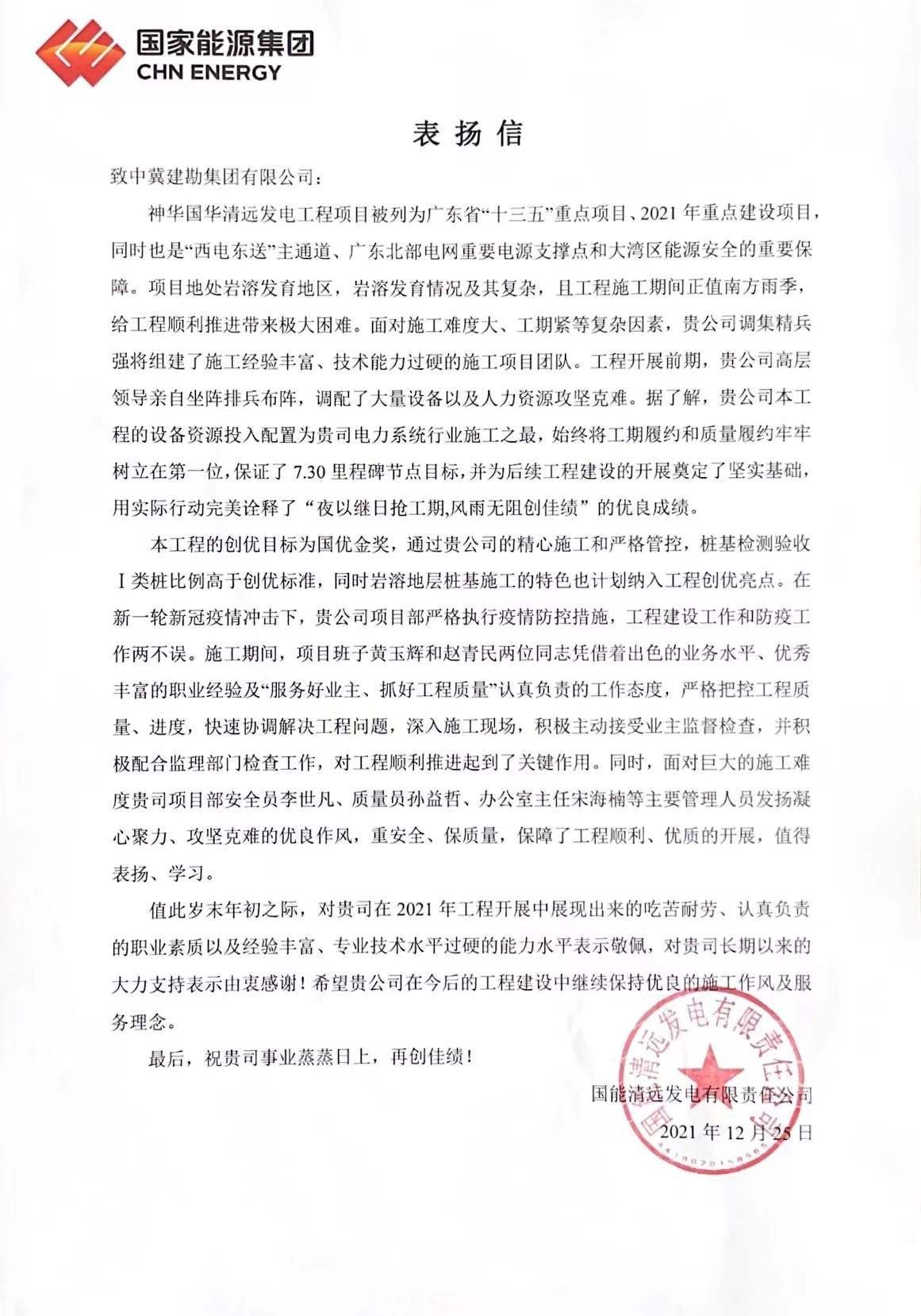 神華國華清遠發(fā)電工程項目被列為廣東省“十三五”重點項目、2021年重點建設(shè)項目,同時也是“西電東送”主通道、廣東北部電網(wǎng)重要電源支撐點和大灣區(qū)能源安全的重要保障。我項目在建設(shè)過程中 “夜以繼日搶工期,風(fēng)雨無阻創(chuàng)佳績”的工作效率得到了高度贊揚。