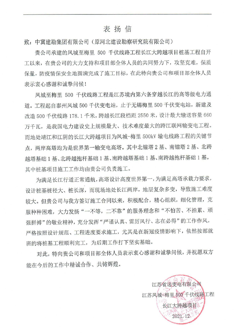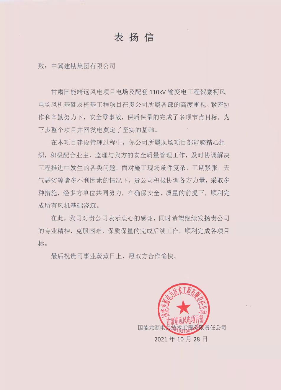 江蘇鳳城梅里500千伏線(xiàn)路工程長(zhǎng)江大跨越項(xiàng)目樁基工程,甘肅國(guó)能靖遠(yuǎn)風(fēng)電項(xiàng)目電場(chǎng)及配套110KV輸變電工程賀寨柯風(fēng)電場(chǎng)風(fēng)機(jī)基礎(chǔ)及樁基工程項(xiàng)目業(yè)主向我公司發(fā)來(lái)表?yè)P(yáng)信,并頒發(fā)了“進(jìn)度、質(zhì)量管理先進(jìn)單位”榮譽(yù)證書(shū),同時(shí),武衛(wèi)新、朱凱云、黃長(zhǎng)楠被評(píng)為“優(yōu)秀項(xiàng)目管理者”榮譽(yù)稱(chēng)號(hào)。