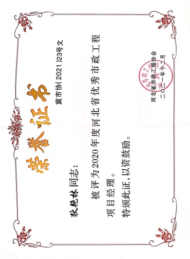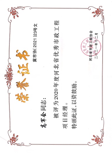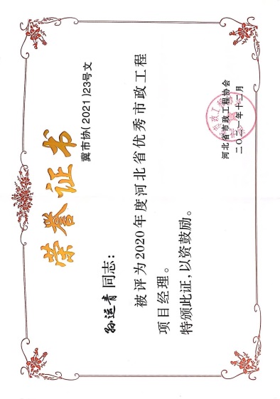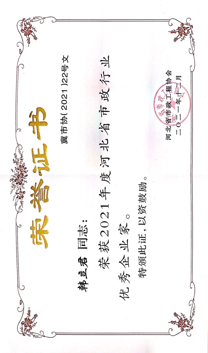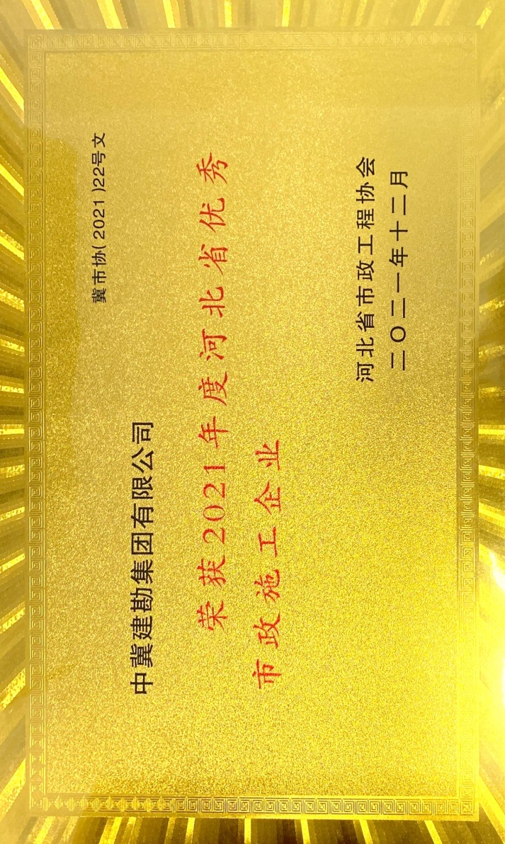 近日,由河北省市政工程協(xié)會(huì)評(píng)選,公司榮獲“2021年度河北省優(yōu)秀市政施工企業(yè)”稱號(hào);韓立君董事長(zhǎng)榮獲“2021年度河北省市政行業(yè)優(yōu)秀企業(yè)家”稱號(hào);孫運(yùn)青、狄艷林、高軍會(huì)、張海蛟四位同志榮獲“2020年度河北省優(yōu)秀市政工程項(xiàng)目經(jīng)理”稱號(hào)。