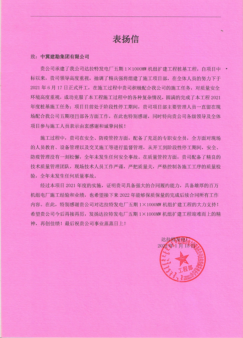 近日,由我公司承建的達(dá)拉特發(fā)電廠五期1×1000MW機組擴(kuò)建項目樁基工程,收到達(dá)拉特發(fā)電廠工程指揮部發(fā)來的表揚信,對我司承接的樁基施工質(zhì)量、安全文明施工、進(jìn)度管控及各方面的配合表示認(rèn)可。