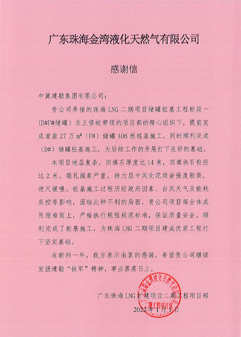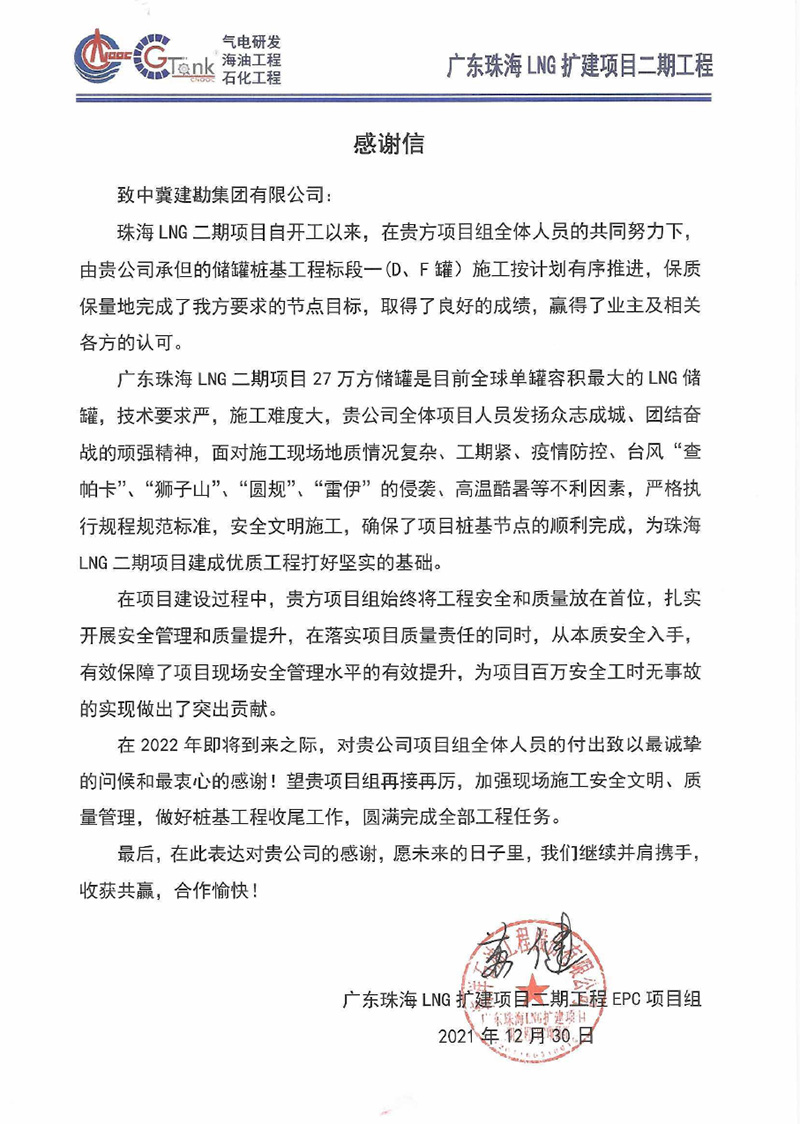 廣東珠海LNG二期項目27萬方儲罐是目前全球單罐容積最大的LNG儲罐,技術(shù)要求嚴(yán),施工難度大。在施工工過程中,全體項目人員發(fā)揚眾志成城、團(tuán)結(jié)奮戰(zhàn)的頑強精神,面對施工現(xiàn)場地質(zhì)情況復(fù)雜、工期緊、疫情防控、臺風(fēng)“查帕卡”、“獅子山”、“圓規(guī)”、“雷伊”的侵襲、高溫酷暑等不利因素,迎難而上,頑強奮戰(zhàn),保質(zhì)、安全、高效地履行合同任務(wù),確保了項目樁基節(jié)點的順利完成,為珠海LNG二期項目建成優(yōu)質(zhì)工程打好堅實基礎(chǔ),為項目百萬安全工時無事故的實現(xiàn)做出了突出貢獻(xiàn),受到業(yè)主及總包方的高度贊揚。