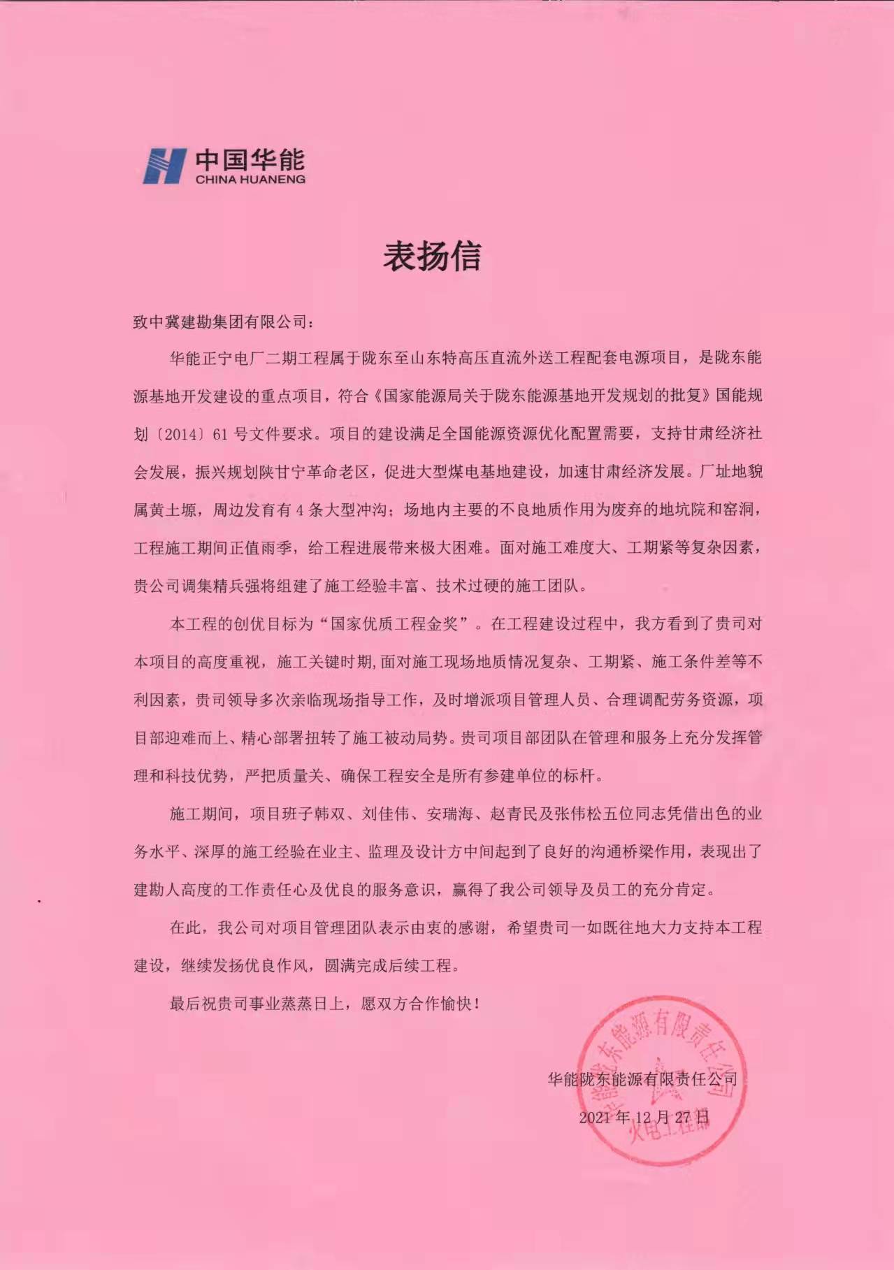 華能正寧電廠二期樁基工程屬于隴東至山東特高壓直流外送工程配套電源項(xiàng)目,是隴東能源基地開發(fā)建設(shè)的重點(diǎn)項(xiàng)目, 在工程建設(shè)過程中面對施工現(xiàn)場地質(zhì)情況復(fù)雜、工期緊、施工條件差等不利因素,項(xiàng)目部迎難而上、精心部署扭轉(zhuǎn)了施工被動局勢。在管理和服務(wù)上充分發(fā)揮管理和科技優(yōu)勢,嚴(yán)把質(zhì)量關(guān)、確保工程安全是所有參建單位的標(biāo)桿。其中項(xiàng)目部班子韓雙、劉佳偉、趙青民、安瑞海及張偉松五位同志憑借出色的業(yè)務(wù)水平、深厚的施工經(jīng)驗(yàn)在業(yè)主、監(jiān)理及設(shè)計(jì)方中間起到了良好的溝通橋梁作用,表現(xiàn)出了建勘人高度的工作責(zé)任心及優(yōu)良的服務(wù)意識,收到業(yè)主及監(jiān)理的高度贊揚(yáng)。