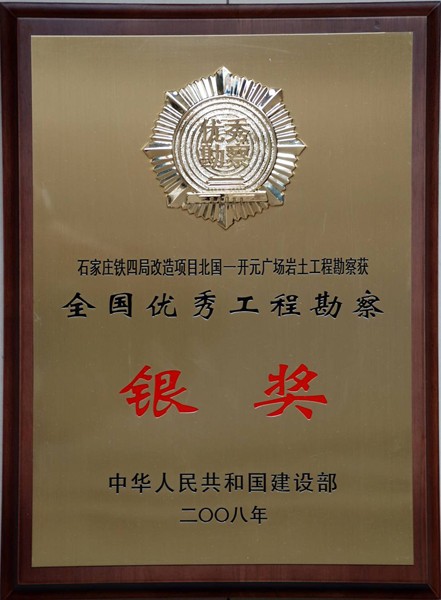 根據(jù)中華人民共和國(guó)建設(shè)部第807號(hào)文件,關(guān)于公布2006年度全國(guó)優(yōu)秀工程勘察設(shè)計(jì)獎(jiǎng)的公告,我單位石家莊鐵四局改造項(xiàng)目北國(guó)—開元廣場(chǎng)巖土工程勘察獲銀質(zhì)獎(jiǎng)。