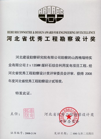 山西格瑞特實業(yè)有限公司2×135MW煤矸石綜合利用發(fā)電項目獲河北省優(yōu)秀工程勘察設(shè)計二等獎。