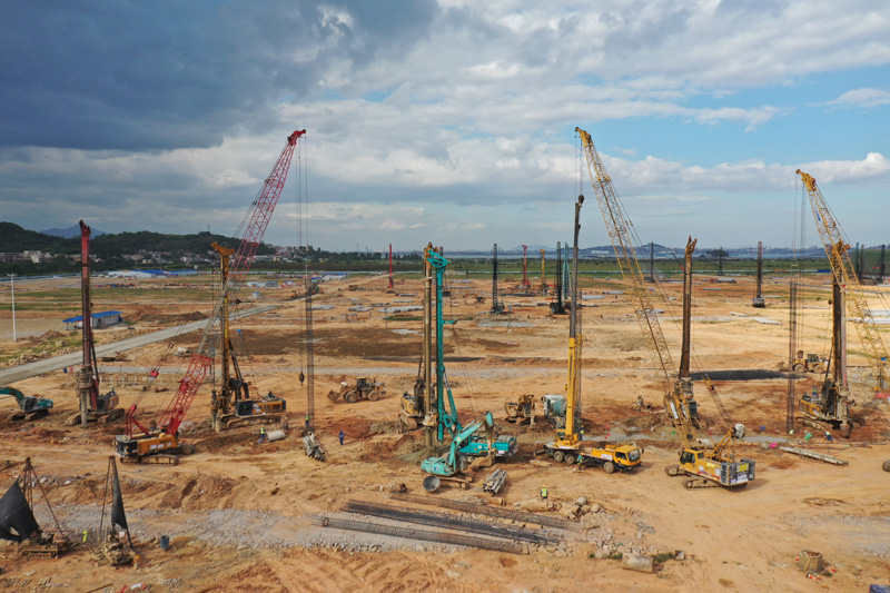 本工程自2021年5月15日開工, 2022年3月19日完工。完成Φ700mm鉆孔灌注樁700余根、Φ800mm鉆孔灌注樁4000余根、Φ1000mm鉆孔灌注樁100余根;PHC預應力管樁完成了PHC400mm共計200余根、PHC500mm共計6600余根、PHC600mm共計400余根,總計7400余根;施工勘察孔完成1500余根;基坑支護工程完成了支護樁Φ800mm鉆孔灌注樁200余根、Φ400mm降水井30余座、基坑錨索200余根、冠梁澆筑約370m、鋼結構腰梁支撐約370m、掛網(wǎng)噴錨約1650㎡、基坑土方開挖約40000m³。
