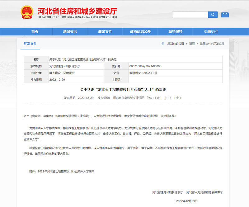 為貫徹落實人才強冀戰(zhàn)略,強化我省工程勘察設計隊伍建設和人才競爭能力,充分發(fā)揮行業(yè)頂尖人才的示范引領作用,近日,河北省住房和城鄉(xiāng)建設廳、河北省人力資源和社會保障廳聯合印發(fā)《關于認定“河北省工程勘察設計行業(yè)領軍人才”的決定》,我公司梁書奇同志被認定為“河北省工程勘察設計行業(yè)領軍人才”。