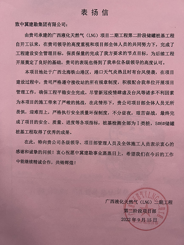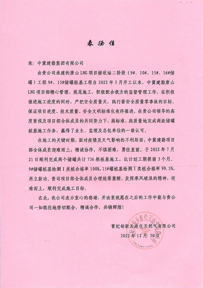 2022年12月30日我公司收到業(yè)主曹妃甸新天液化天然氣有限公司發(fā)來的表揚信。由我公司承建的唐山LNG項目接收站二階段(9#、10#、15#、16#儲罐)工程9#、15#儲罐樁基工程,主要施工內(nèi)容為736根樁徑1.4m、樁長71m/74m混凝土灌注樁,本項目自2022年5月31日開工以來,在唐山LNG項目部精心管理、規(guī)范施工下,嚴把安全質(zhì)量關(guān),踐行著安全質(zhì)量零事故目標,于2022年7月21日順利完成所有施工任務,贏得業(yè)主、監(jiān)理及總包的一致認可。樁基檢測完成后,9#儲罐樁基檢測I類樁率100%,15#儲罐I類樁率99.5%,再創(chuàng)新高。在施工過程中,項目部全體成員面對惡劣天氣的不利影響及新冠疫情肆虐的局面,迎難而上,精誠協(xié)作,砥礪前行,淋漓盡致地詮釋了建勘人的鐵軍精神,為項目順利完成奠定堅實基礎。