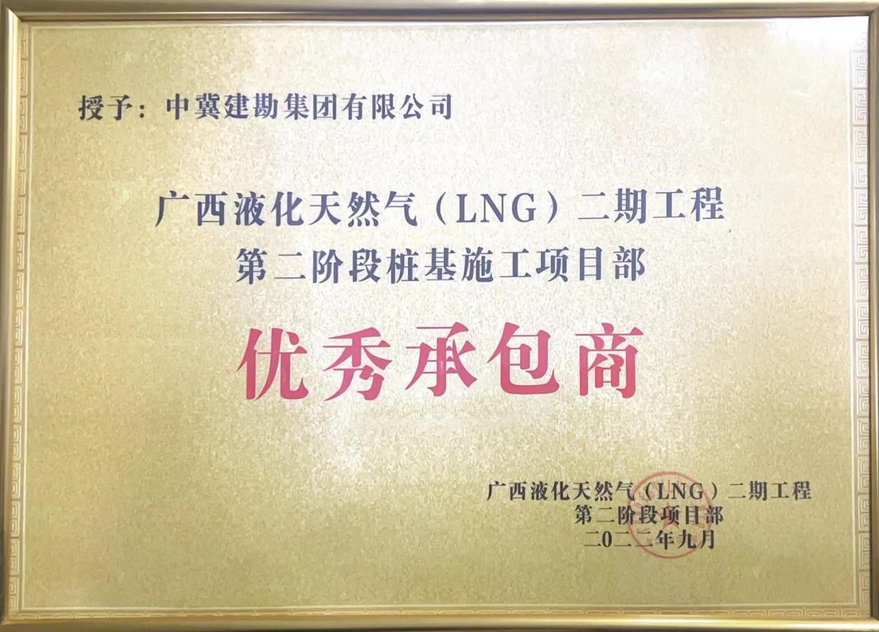 廣西液化天然氣LNG項目5#6#儲罐樁基項目是國家管網(wǎng)集團北海液化天然氣有限責任公司非常重視的項目。我公司自2022年04月承接了廣西LNG二期項目儲罐樁基施工,本項目于2022年5月20日開始,7月11日完成。從施工開始,本項目24小時晝夜不間斷施工,為保障工程高質(zhì)量高效率完成,施工期間,建設單位、PMC單位、監(jiān)理單位及施工單位配備了充足的管理人員及施工人員,在疫情肆虐,天氣炎熱,雨季臺風等一系列困難重重之下,廣西LNG項目部全體員工保持高度的工作熱情,克服一切艱難險阻,順利完成了樁基施工全部任務。樁基檢測結(jié)果全部為Ⅰ類樁,保質(zhì)保量的完成了各個里程碑節(jié)點目標,榮獲國家管網(wǎng)集團北海液化天然氣有限責任公司廣西北海LNG二期項目部的表揚信及優(yōu)秀優(yōu)秀承包商集體榮譽。