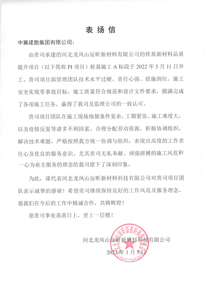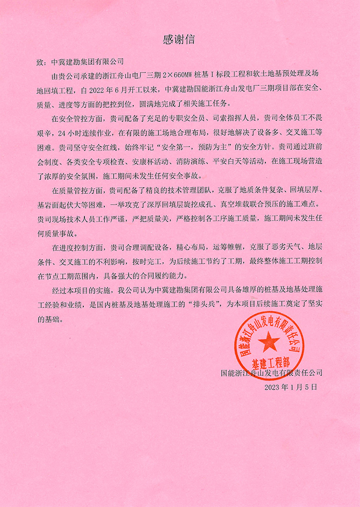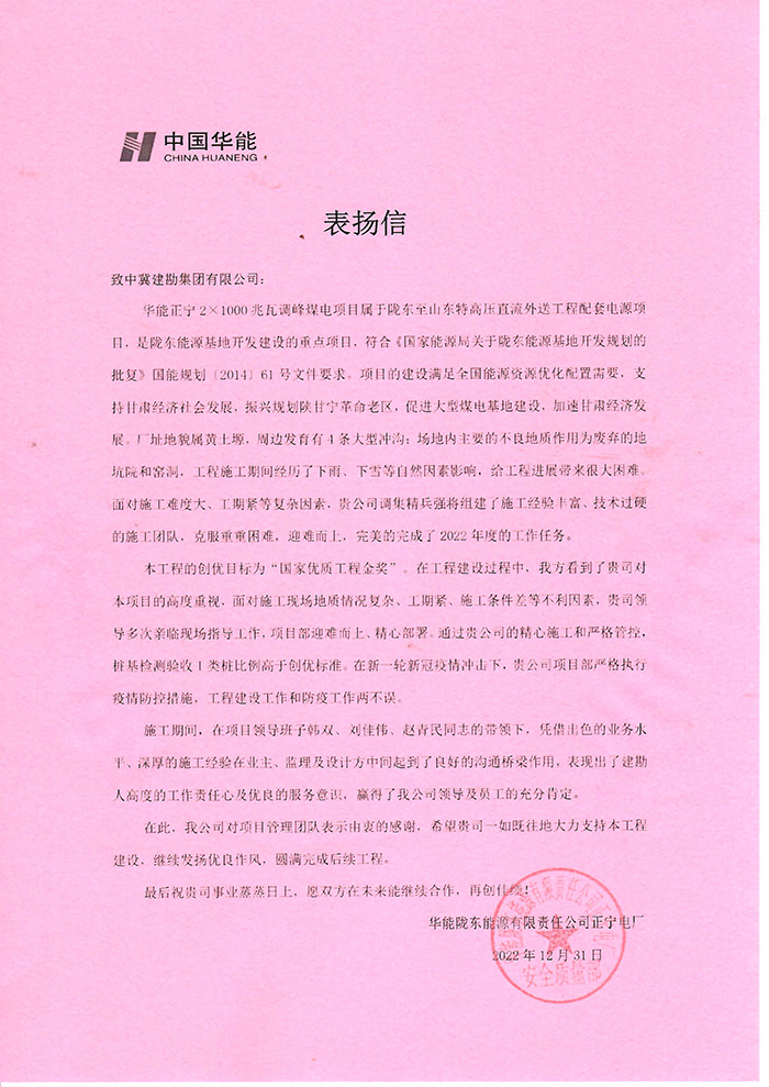 我公司華能甘肅正寧電廠二期工程項目部收到業(yè)主方華能隴東能源公司正寧電廠發(fā)來的表揚信,施工期間,在項目領(lǐng)導的帶領(lǐng)下,憑借出色的業(yè)務水平、深厚的施工經(jīng)驗在業(yè)主、監(jiān)理及設計方中間起到了良好的溝通橋梁作用。本工程的創(chuàng)優(yōu)目標為“國家優(yōu)質(zhì)工程金獎”,我單位負責的B標段樁基檢測驗收I類樁比例高于創(chuàng)優(yōu)標準。在新一輪新冠疫情沖擊下,項目部嚴格執(zhí)行疫情防控措施,工程建設工作和防疫工作兩不誤表現(xiàn)出了建勘人高度的工作責任心及優(yōu)良的服務意識,贏得了華能隴東能源公司領(lǐng)導及員工的充分肯定。