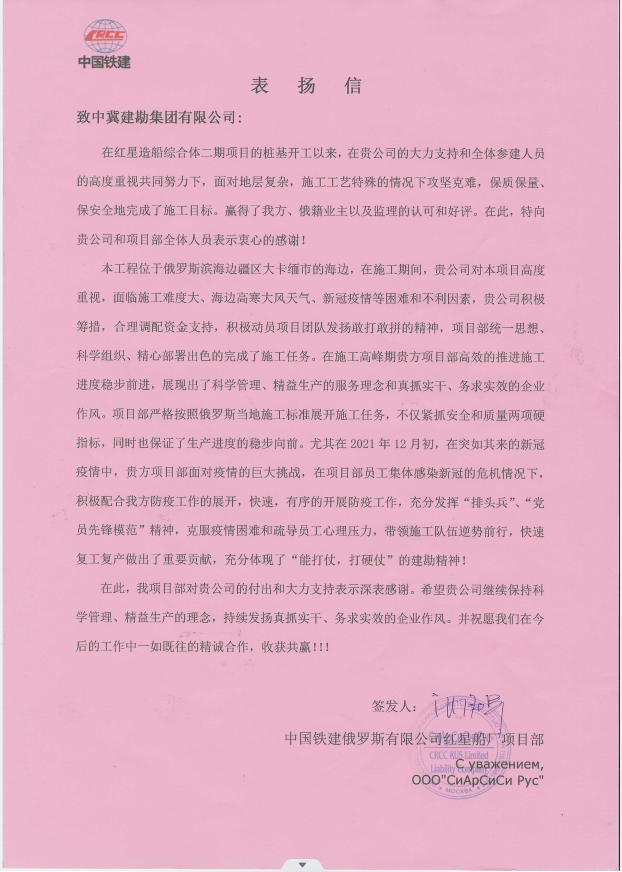 俄羅斯海參崴紅星造船綜合體(二期)項目,收到中國鐵建俄羅斯紅星船廠項目部的表揚信,施工期間,在項目領(lǐng)導的帶領(lǐng)下,項目部統(tǒng)一思想、科學組織,經(jīng)過305天的奮戰(zhàn),項目部完成了質(zhì)量安全零事故,保質(zhì)保量促進生產(chǎn)的任務目標。我公司負責的302、303、304廠房樁基檢測驗收全部合格。在施工高峰期克服了 新冠疫情、高寒天氣、俄烏戰(zhàn)爭影響等諸多困難和不利因素,采取24小時不間斷施工,積極調(diào)配合理高效的推進施工進度穩(wěn)步前進。尤其在突如其來的新冠疫情中,項目部面對疫情的巨大挑戰(zhàn),積極采取措施,配合防疫工作的展開,快速,有序的開展隔離工作,安撫感染人員恐慌情緒。這種科學防疫、積極組織為后期快速復工復產(chǎn)做出了重要貢獻,得到了總包單位的充分肯定和表揚。