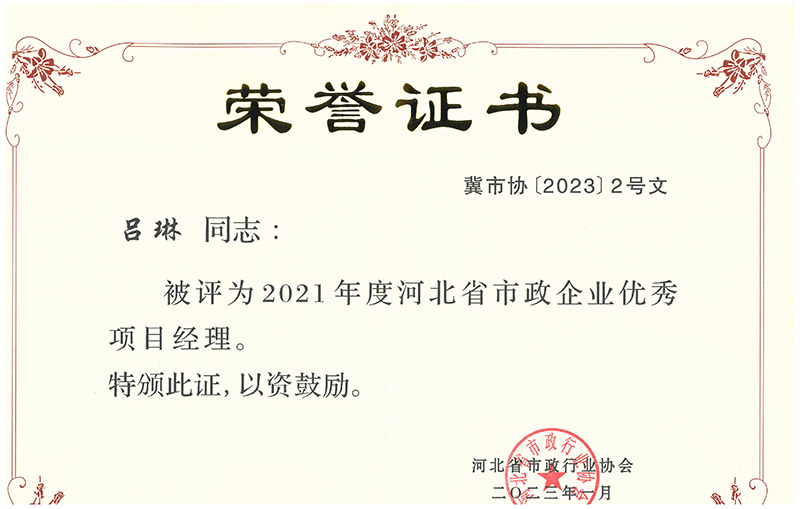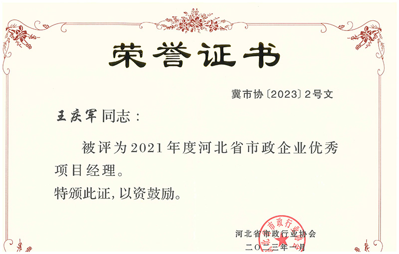 近日,經(jīng)河北省市政行業(yè)協(xié)會組織選拔并發(fā)文公布,我公司王慶軍同志、呂琳同志榮獲 “2021年度河北省市政企業(yè)優(yōu)秀項(xiàng)目經(jīng)理” 榮譽(yù)稱號;陳軍紅同志、張樹楹同志榮獲“2022年度河北省市政企業(yè)優(yōu)秀項(xiàng)目總工程師”榮譽(yù)稱號。