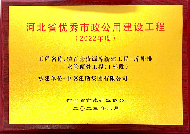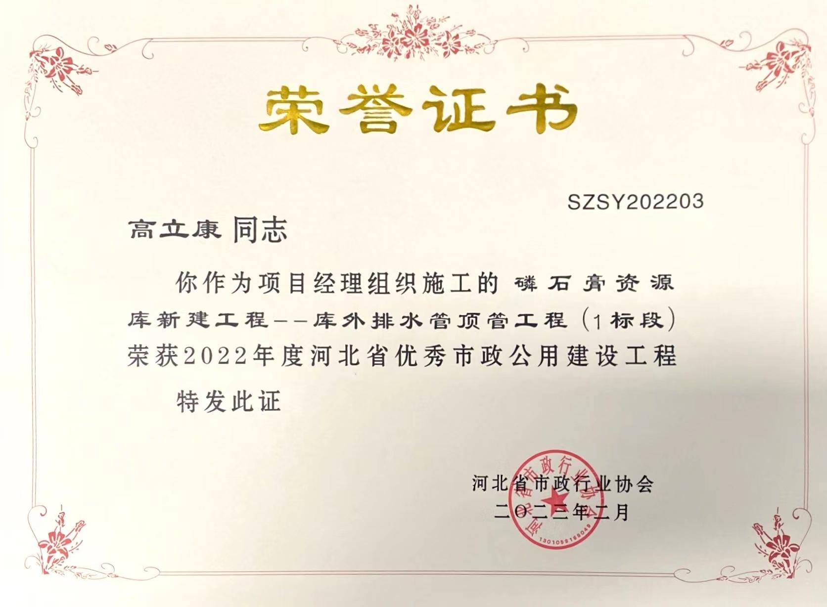近日,河北省市政行業(yè)協(xié)會發(fā)布消息,經(jīng)過審核申報材料、查驗施工現(xiàn)場、專家綜合評議,我公司市政工程項目“磷石膏資源庫新建工程——庫外水管頂管工程(1標(biāo)段)”被評為河北省優(yōu)秀市政公用建設(shè)工程,并為項目經(jīng)理高立康同志頒發(fā)了榮譽(yù)證書。