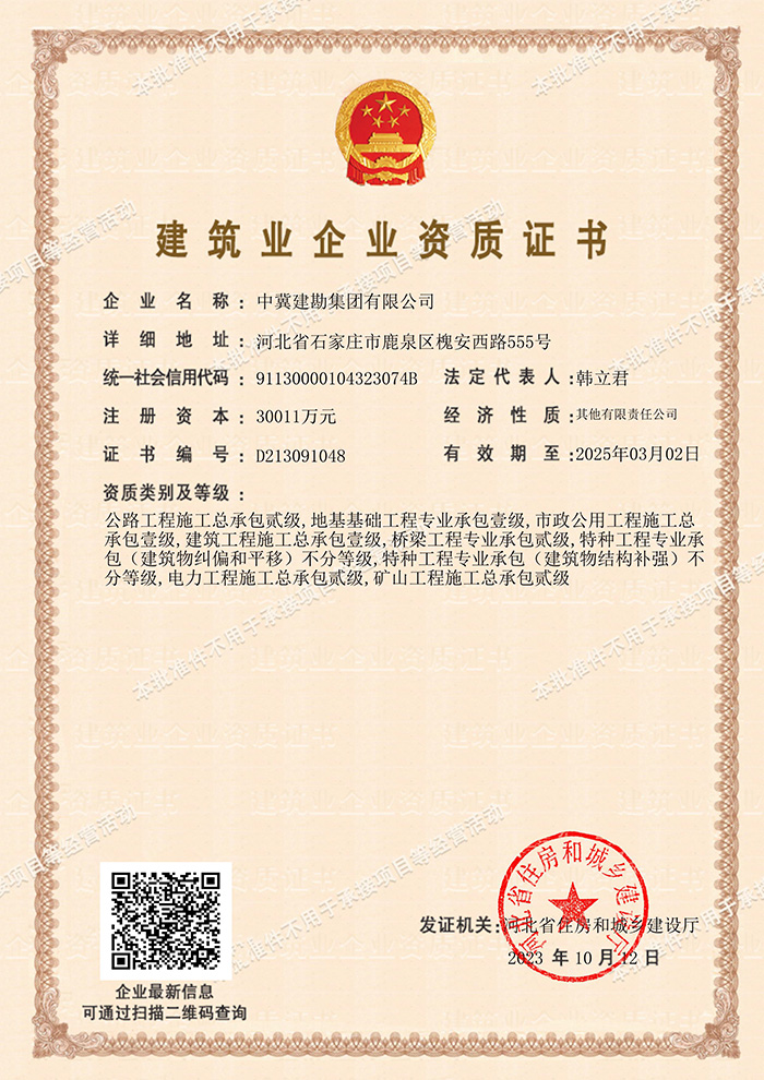 為拓展公司業(yè)務范圍,在公司領(lǐng)導的精心策劃下,經(jīng)過安全生產(chǎn)部的不懈努力,集團公司于2023年10月12日經(jīng)河北省交通廳、河北省住建廳審核批準,成功取得了公路工程施工總承包貳級資質(zhì),該資質(zhì)的取得將為集團公司拓展縣、鄉(xiāng)、村公路工程業(yè)務提供了先決條件,為增強地方市場的開拓能力、提高地方市場競爭力提供有力支撐,將在助力集團公司高質(zhì)量發(fā)展、升級轉(zhuǎn)型上貢獻更大力量。