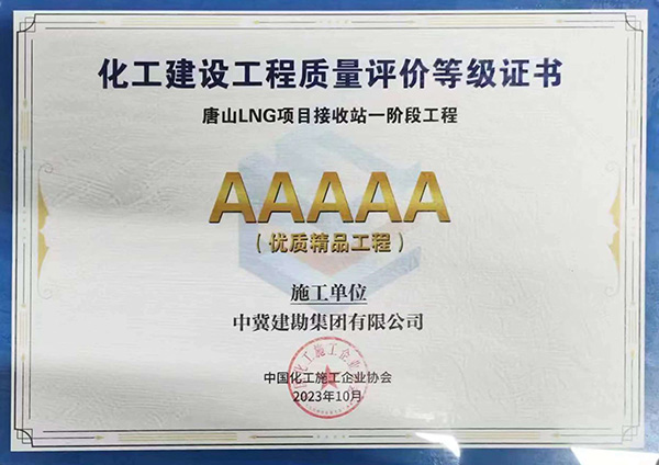唐山LNG項目接收站一階段工程榮獲化工行業(yè)“AAAAA優(yōu)質精品工程”