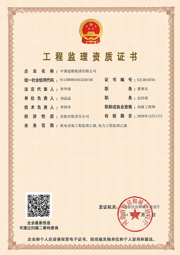 為進(jìn)一步拓展公司業(yè)務(wù)范圍,完善工程監(jiān)理資質(zhì)類別,集團(tuán)公司于2024年9月10日通過河北省住房和城鄉(xiāng)建設(shè)廳審核,取得了機(jī)電安裝工程監(jiān)理乙級(jí)資質(zhì)。