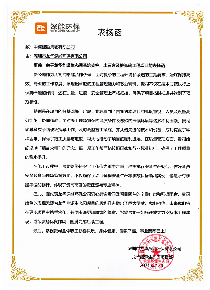 2024年12月20日,深圳市龍華深能環(huán)保有限公司發(fā)來表揚(yáng)信,對(duì)我公司正在施工的龍華能源生態(tài)源基坑支護(hù)、土石方及樁基礎(chǔ)工程項(xiàng)目在施工過程中,面對(duì)復(fù)雜的工程環(huán)境和緊迫的工期要求,始終保持高效、專業(yè)的工作態(tài)度,展現(xiàn)出卓越的工程管理能力和敬業(yè)精神,在技術(shù)方案執(zhí)行上嚴(yán)謹(jǐn)?shù)淖黠L(fēng),質(zhì)量、進(jìn)度、安全管理上嚴(yán)格的把控,以及我公司領(lǐng)導(dǎo)多次親臨現(xiàn)場(chǎng)指導(dǎo)工作,確保了項(xiàng)目按時(shí)推進(jìn)并達(dá)到了預(yù)期標(biāo)準(zhǔn),表示了衷心的感謝,并表達(dá)了未來將有更多的項(xiàng)目攜手合作。