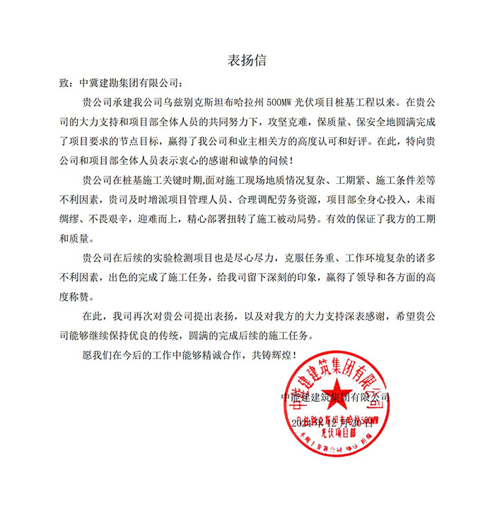 2024年12月20日,中能建建筑集團(tuán)有限公司發(fā)來表揚(yáng)信,對(duì)我公司施工的烏茲別克斯坦布哈拉州500MW光伏項(xiàng)目樁基工程及實(shí)驗(yàn)檢測(cè)項(xiàng)目施工過程中,未雨綢繆,攻堅(jiān)克難,合理調(diào)配人員和設(shè)備資源,克服了各種不利因素,保證了工程和質(zhì)量,出色的完成了施工任務(wù),贏得了領(lǐng)導(dǎo)和項(xiàng)目參建單位的高度稱贊,給予了表揚(yáng),并表示愿今后的工作中能夠繼續(xù)精誠合作。