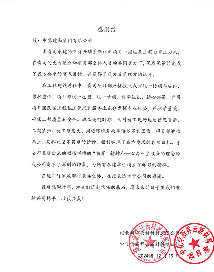 2024年12月19日,湖北新祥云新材料有限公司發(fā)來感謝信,對(duì)我公司正在施工的新祥云磷系新材料項(xiàng)目一期樁基工程在施工過程中,嚴(yán)格按照業(yè)主統(tǒng)一協(xié)調(diào)和安排,勇?lián)負(fù)?dān),面對(duì)地質(zhì)情況復(fù)雜、工期緊張、施工難度大等諸多不利因素,項(xiàng)目部迎難而上,發(fā)揮功堅(jiān)克難的精神,順利完成了各項(xiàng)目標(biāo)。對(duì)項(xiàng)目部表現(xiàn)出來的頑強(qiáng)拼搏的“鐵軍”精神和一心為業(yè)主服務(wù)的理念給予了表揚(yáng),特在年終歲尾之際發(fā)來感謝信。