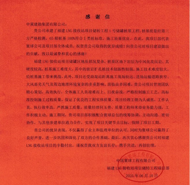 2025年6月12日,我公司收到中國寰球福建LNG接收站項(xiàng)目儲轉(zhuǎn)工程項(xiàng)目發(fā)來的感謝信。信中高度贊揚(yáng)了我公司在項(xiàng)目執(zhí)行過程中展現(xiàn)出的項(xiàng)目高效的團(tuán)隊(duì)管理、精心策劃、高效執(zhí)行。