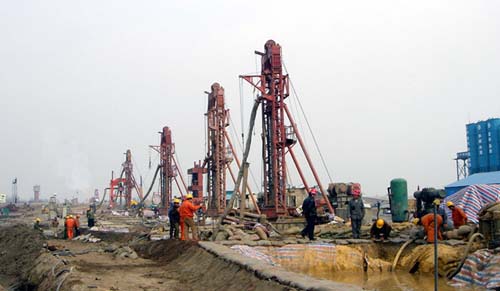 工程地點(diǎn)位于武漢市天興洲。施工時(shí)間2005年1月至2006年4月。引橋7#、9#、10#、11#墩,樁徑1.5m、樁長(zhǎng)65-70m,72根,樁端嵌入弱膠結(jié)泥質(zhì)礫巖近30m,巖石強(qiáng)度14MPa。01#-09#φ2.5m鉆孔,樁長(zhǎng)65-75m,95根樁端嵌入強(qiáng)膠結(jié)泥質(zhì)、鈣礫巖約40m,巖石強(qiáng)度20-60MPa,施工難度極大。