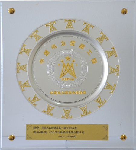 近日,我公司參與施工的華能大慶綠源風電一期192MW工程(新立、五棵樹風電場風機樁基礎施工)被中國電力建設企業(yè)協(xié)會評為2013年度“中國電力優(yōu)質(zhì)工程獎”。